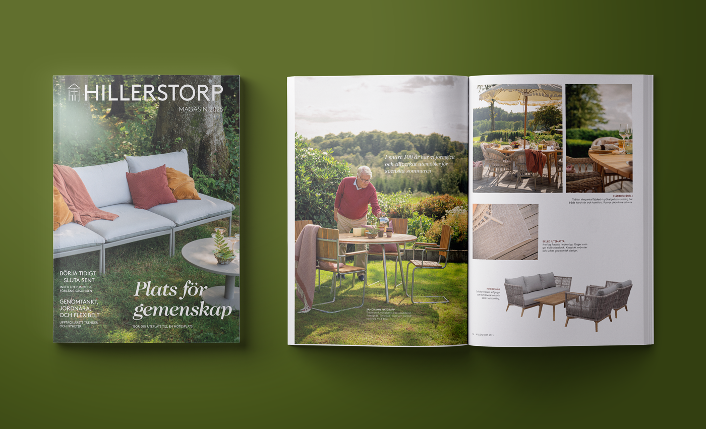 Som Skandinaviens största tillverkare av trädgårdsmöbler har Hillerstorp gett oss förtroendet att bygga varumärket genom magasin, digitala kampanjer och en visuell identitet som inspirerar till ett rikare uteliv. Tillsammans med Hillerstorp har vi under många år arbetat med att skapa en enhetlig kommunikation som förenar det tryckta magasinet med digital närvaro. Magasinet fungerar som en inspirationskälla för konsumenter och ett verktyg för återförsäljare, där produkter presenteras i miljöer som väcker känslan av sommar, gemenskap och livet utomhus.